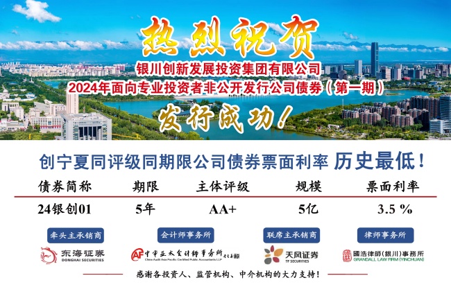8月30日,銀川創(chuàng)新發(fā)展投資集團(tuán)有限公司2024年第一期面向?qū)I(yè)投資者非公開發(fā)行公司債券成功發(fā)行。本期債券發(fā)行規(guī)模5億元,期限:5年,票面利率:3.5%,創(chuàng)寧夏區(qū)域內(nèi)5年期私募債發(fā)行利率歷史最低。本期債券的成功發(fā)行,充分體現(xiàn)了資本市場對銀川市和創(chuàng)投集團(tuán)的認(rèn)可,降低了集團(tuán)融資成本,為集團(tuán)公司后續(xù)服務(wù)銀川市產(chǎn)業(yè)發(fā)展奠定了良好基礎(chǔ)。